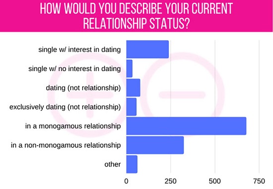 Just over 46 percent were in a monogamous relationship, while about 22 percent were in a non-monogamous one. About 4.2 percent did not feel these choices described their situation, many stating that they were poly, married, “monogamish” (Dan Savage’s term for mostly monogamous but flexible enough to contain some occasional play with others), or monogamous but desiring to open their relationship.