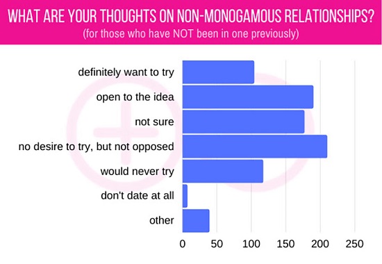 “It wasn’t for me,” said 8.91 percent who had experienced non-monogamy. 42.79 percent are monogamous now and do not want to change. 27.23 percent felt they didn’t have the time for more than one partner. 52.19 percent cited “fear of physical/emotional vulnerability.” 7.78 percent cited religious or cultural restrictions, and 16.69 percent were afraid of friends and family judging them.