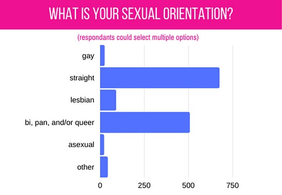 With the option to choose multiple checkboxes, 52.85 percent identified as cis female and 33.99 percent as cis male, while 1.19 percent stated they were trans women, 2.14 percent were trans men, 1.27 percent were agender, and a combined 18 percent (approximately) identified as nonbinary, gender non-conforming, genderqueer or genderfluid. Also noted: undecided, human, intersex and “just me.”