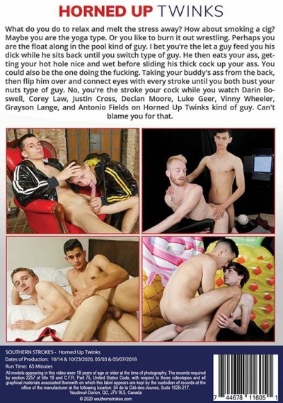 COCOA BEACH, FL — (02-06-21) — Southern Strokes and Pulse Distribution are gearing up to release Corey Law and Darin Boswell starring in ‘Horned Up Twinks’ DVD (2021). The 18-25 bareback twink production written and directed by Joel Knight, also stars Antonio Fields, Declan Moore, Grayson Lange, Justin Cross, Luke Geer and Vinny Wheeler.