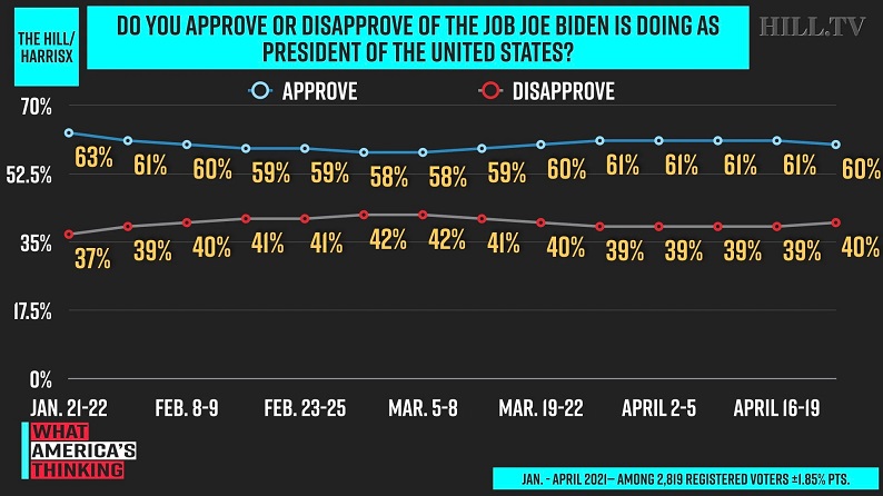 Sixty-percent of registered voters surveyed between April 26-28, said they approve of the job the 46th president of the United States is doing, down only 1 percent from the Hill-HarrisX poll from last week.