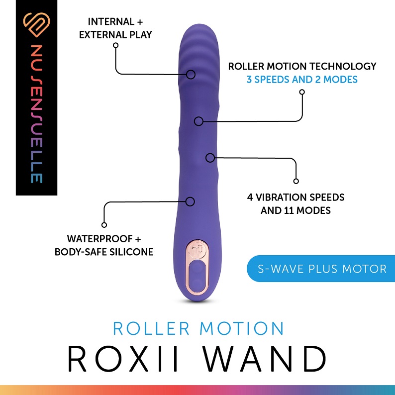 Roxii is a wand fashioned for both internal and external play, the flexible tip and elongated handle make it the perfect pleasure product for G-Spot stimulation. Roxii’s kick stems from the the S-Wave Plus motor that features 4 speeds and 11 modes and the independently controlled roller motion feature.